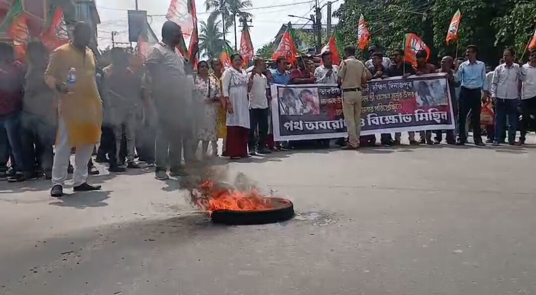 উত্তরবঙ্গের বন্যা পরিদর্শনকালে বিধায়ক ও সাংসদকে মারধরের অভিযোগে বালুরঘাটে বিজেপির বিক্ষোভ।