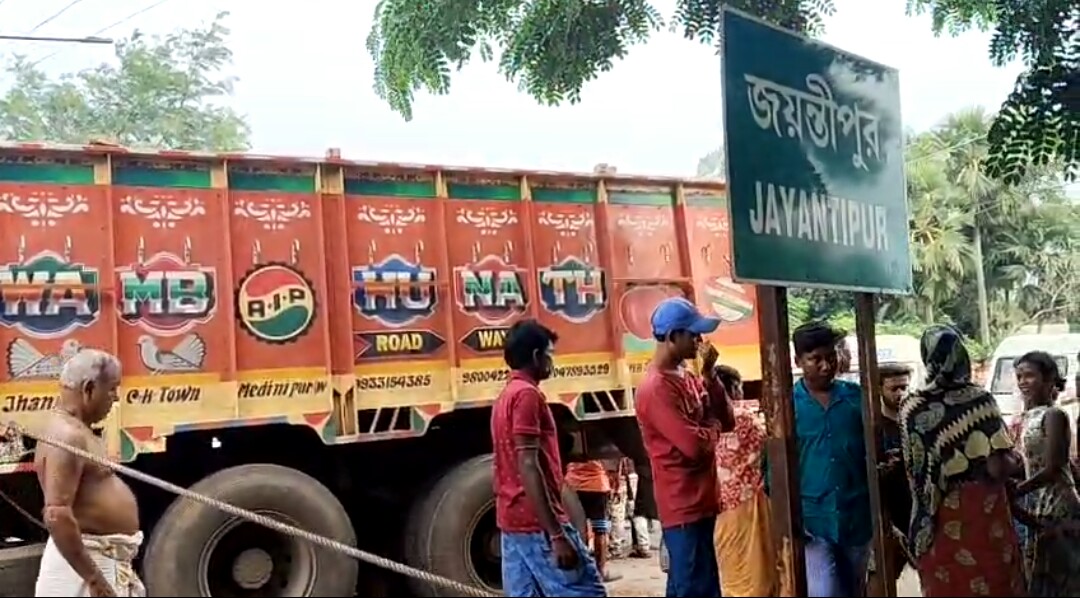 ট্রাক দুর্ঘটনায় রণক্ষেত্র জয়ন্তীপুর, মদ্যপ চালক ও খালাসিকে গাছে বেঁধে উত্তেজিত জনতার ধাওয়া।