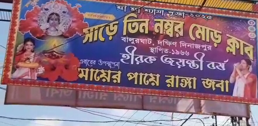 হীরকজয়ন্তী বর্ষে সাড়ে তিন নম্বর মোড় ক্লাবের কালীপুজো — থিম ‘মায়ের পায়ে রাঙা জবা’।