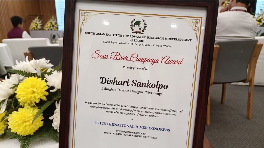 দক্ষিণ দিনাজপুর, নিজস্ব সংবাদদাতাঃ- ২০০৬ থেকে এ যাবৎ পরিবেশ প্রেমী সংস্থা দিশারী সংকল্প বালুরঘাট বালুরঘাট তথা দক্ষিণ দিনাজপুরে নদী ও প্রকৃতির বিষয়ে নানান রকমের পরিবেশ কর্মসূচি ধারাবাহিকভাবে করে আসছে। তারই পুরস্কার স্বরূপ ‘সেভ রিভার ক্যাম্পেন’ সম্মাননা মিলল চতুর্থ আন্তর্জাতিক রিভার কংগ্রেসে। নিউ দিল্লি তে ইন্ডিয়া ইন্টারন্যাশনাল সেন্টারে সাউথ এশিয়ান ইনস্টিটিউট ফর এডভান্স রিসার্চ এন্ড ডেভেলপমেন্ট এবং সেন্টার ফর রিভার অ্যাফেয়ার্সের যৌথ আয়োজনে চতুর্থ আন্তর্জাতিক রিভার কংগ্রেসে এই সম্মাননা প্রদান করা হলো দেশের সংকল্পের সম্পাদক পরিবেশ চিন্তক তুহিনশুভ্র মন্ডলের হাতে।